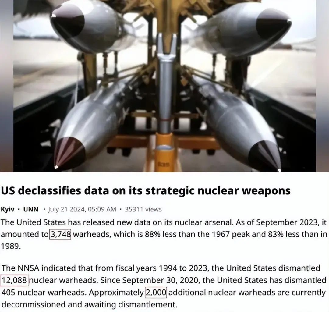数据显示,截至2023年9月,美国共计有3748枚核弹头。美方还详细公布了自1994年至2023年财政年度期间,共销毁了逾1.2万枚核武的消息。