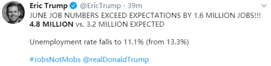 起因,是半个小时之前,美国劳工就业报告出炉,6月份失业率降至11.1%,非农就业人口环比增加480万,双双明显好于预期。